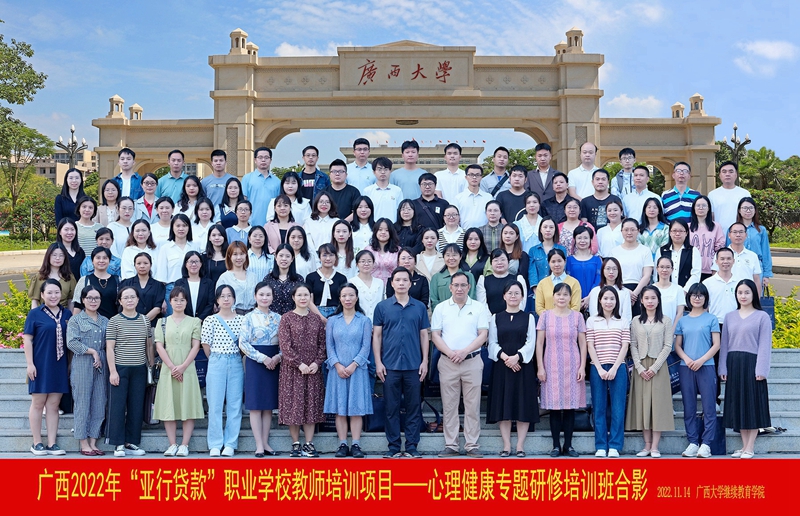 为提高职业院校心理健康教育专兼职教师开展心理辅导、心理干预、心理调节、心理防控等能力和水平,11月13日至19日,由广西壮族自治区教师培训中心主办、我校继续教育学院承办的广西2022年“亚行贷款”职业学校教师培训项目—心理健康专题研修培训班在米兰体育举办,来自全区高职院校、区直中职学校和地市中职学校的心理健康教育专兼职教师共98名参加培训。