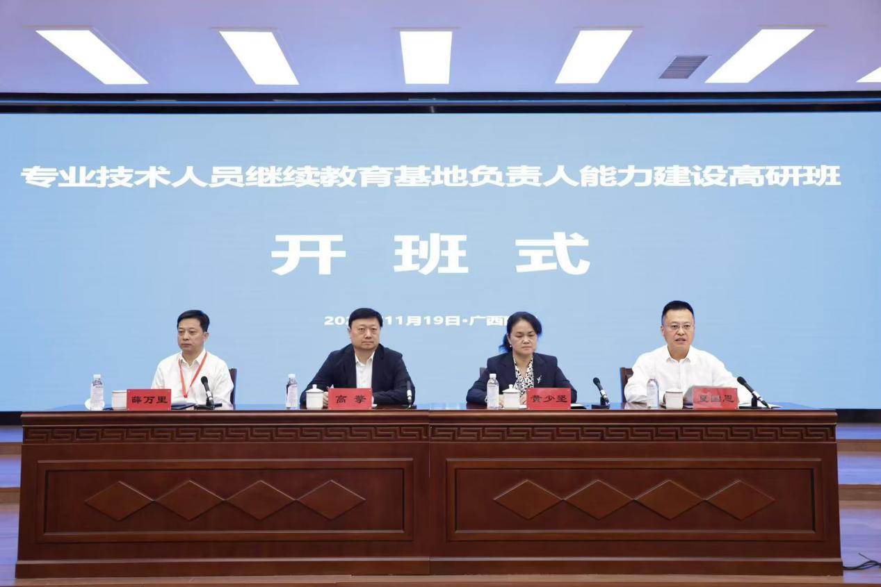1119上午,由人力资源和社会保障部举办的国家专业技术人员继续教育基地负责人能力建设高研班在我校开班。人力资源和社会保障部专业技术人员管理司二级巡视员高擎,广西壮族自治区人力资源和社会保障厅二级巡视员黄少坚,校党委常委、副校长夏国恩出席开班式。开班式由人力资源和社会保障部事业单位人事服务中心副主任薛万里主持。