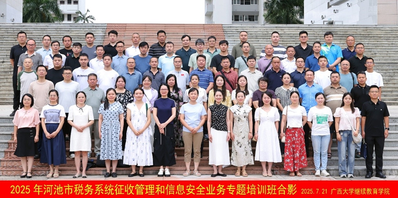 7月21日,2025年河池市税务系统征收管理和信息安全业务专题培训班在我校开班。本次培训班由国家税务总局河池市税务局主办,广西大学承办,为期5天,河池市税务局共73名各级干部参加本次培训。
